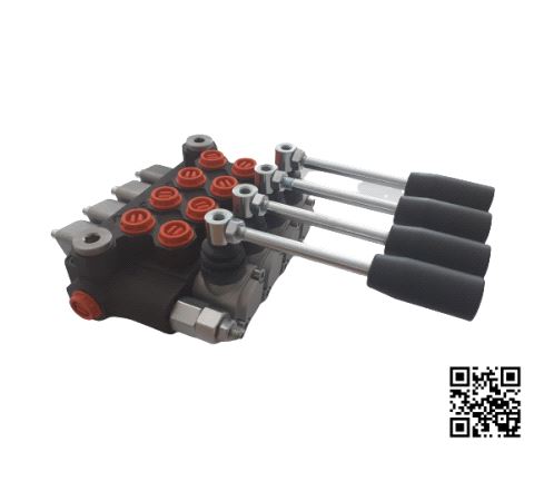 4 seksjon monoblokk ventil kryss parallel AB sengt midtstilling. nominell volumstrøm 25L/min maks trykk 250 Bar.